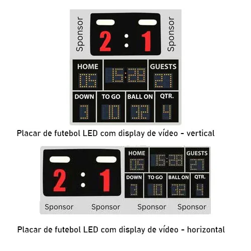 固定数字とビデオボードを備えたこのタイプは、ファンとの交流を深めたい学校やクラブに最適です。標準的な試合情報の表示に加え、インスタントリプレイ、アニメーション、スポンサー広告の表示も可能です。