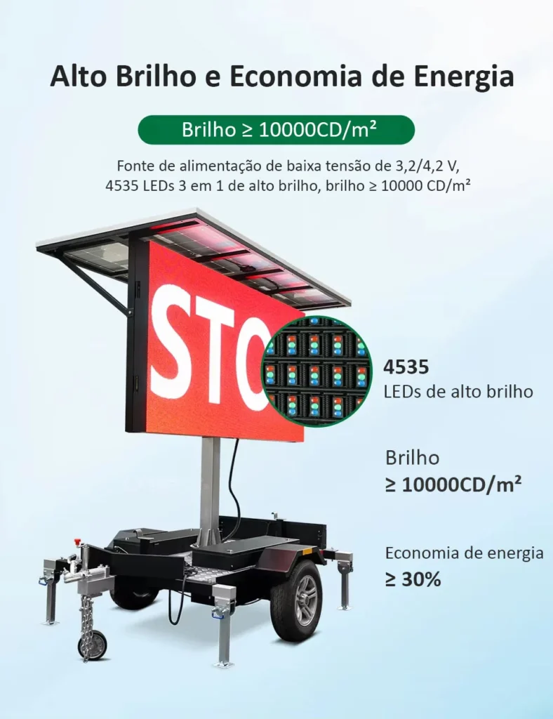 - Высокая яркость и энергоэффективность – Работает от низковольтной системы 3,2/4,2 В. Светодиодный дисплей для прицепов серии TCR Использует 4535 сверхъярких светодиодов «3 в 1» с энергопотреблением ≥ 10 000 кд/м². Яркость регулируется автоматически, обеспечивая чёткое изображение днём и ночью при низком энергопотреблении.