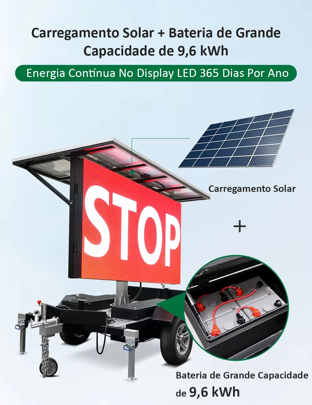 - Солнечная энергия с аккумулятором большой емкости – Оснащенный солнечной зарядкой и аккумулятором большой емкости 9,6 кВт·ч, прицеп может обеспечивать непрерывную работу светодиодного дисплея круглый год, обеспечивая надежную работу в течение 365 дней.