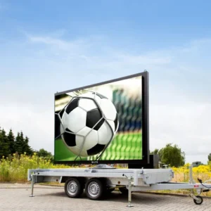 Trailer LED móvel para aluguel de eventos, exibe jogos ao vivo em HD com alta taxa de atualização e efeito imersivo para esportes.